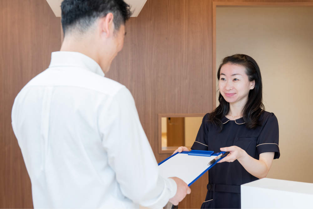 ご予約頂いており、問診にご回答も頂いている方はそのまま受付番号をお渡します。お掛けになって診察の順番をお待ちください。 問診をご回答頂いていない方は、受付でご用件をお伺いします。 なるべくプライバシーには配慮いたしますので、ご安心ください。 以降、患者さんは番号でお呼びいたします。(プライバシーの観点から他の患者さんの前で名前でお呼びはしません)